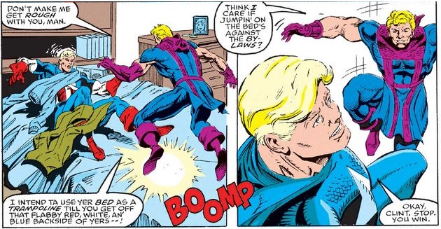 When Steve turns to his feelings of ineffectiveness as Avengers leader, Clint suggests—partially in jest, I trust—that they both quit altogether and form a Superhero Ethics Squad, but Steve doesn’t want to “compete” for action. (Tell that to the Fantastic Four, the various X-Men teams, the New Warriors…)