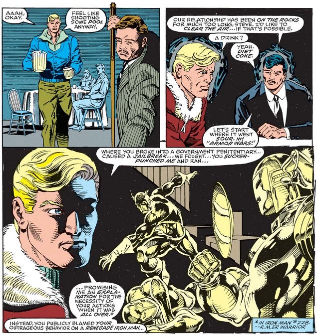 As the expert marksman goes off to relieve some of the local rubes of their cash, the other two longtime Avengers get down to it, rehashing the history of their ethical conflicts to date, in an early (and less violent) version of 2006’s Iron Man/Captain America: Casualties of War #1 (during the Civil War). They begin with the Armor Wars episode, which reached its head in Iron Man #228…