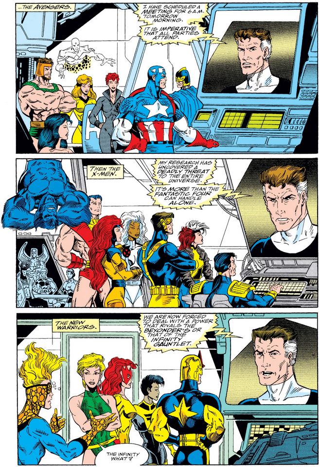 Infinity War #1, June 1992: Jim Starlin (writer), Ron Lim (pencils), Al Milgrom (inks), Max Scheele and Ian Laughlin (colors), Jack Morelli (letters). (More details at Marvel Database.)