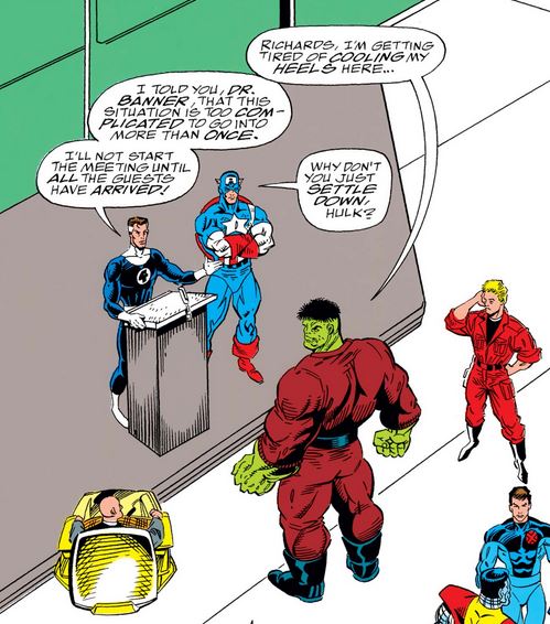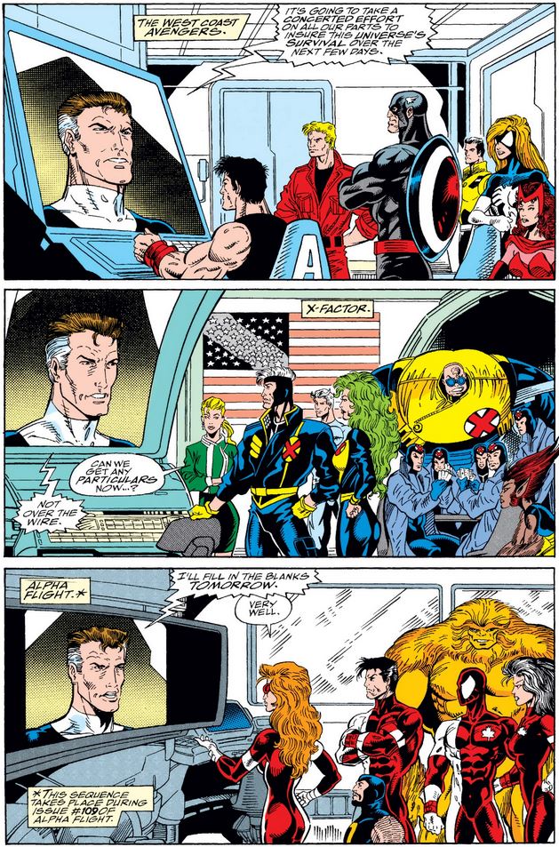 Coincidentally, Death’s Head II #4 also involves versions of our heroes from another dimension: Below, several people from that dimension meet the (oddly colored) 616 versions, led by a commanding yet polite Captain America.