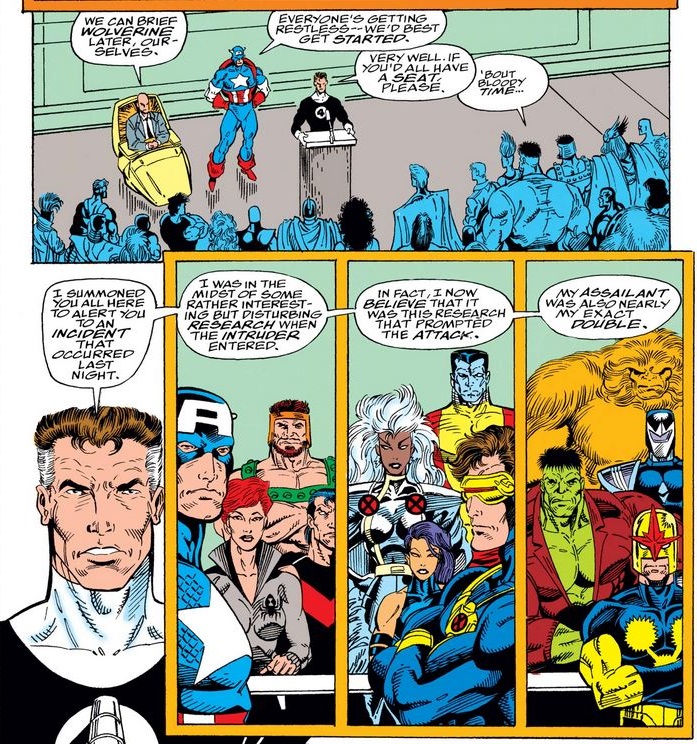 Iron Man—actually his alien replacement, but you could easily confuse it for Tony in one of his “moods”—finally arrives and tells the group that Hawkeye (who was replaced) and Spider-Man (who defeated his replacement before being defeated by the imposters Iron Man and Hawkeye) won’t be coming, and Professor Xavier makes a mental note to talk to Wolverine (who has defeated his imposter and will show up soon). “Reed” gives a fairly accurate account of what happened to him in the last issue, leaving out the fact that he is the “nearly exact double.”