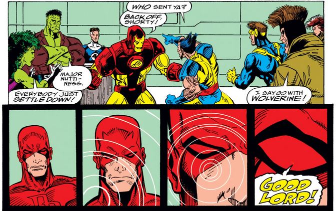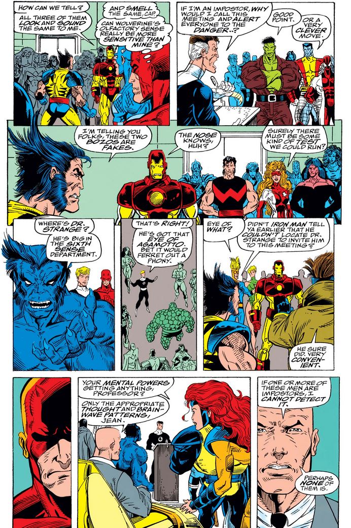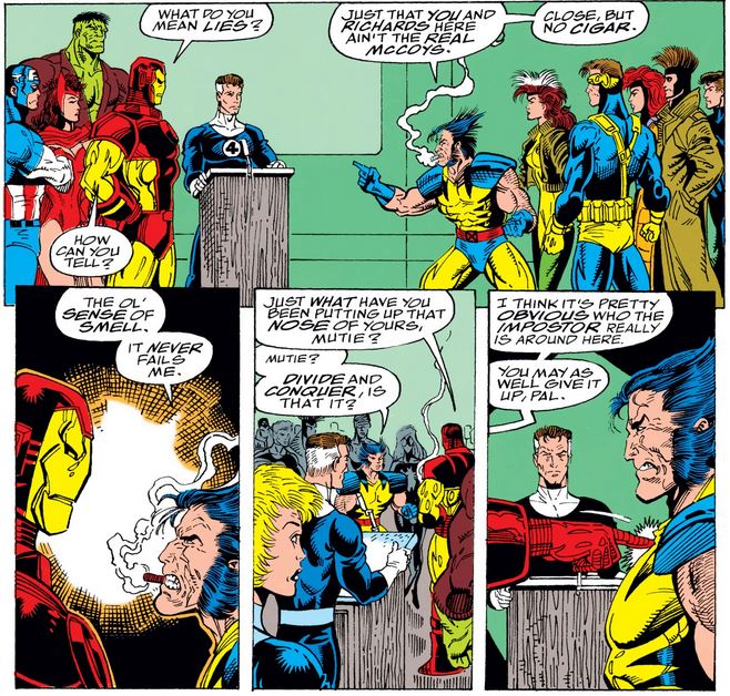 Some of the heroes, including Daredevil, are respectfully skeptical that anyone could duplicate anyone that precisely, given the unique physiology of someone like Reed, until Wolverine barges in, with his own story of fighting an imposter, and calls out Reed and Tony as imposters themselves. (I wonder how he can smell anything with all that cigar smoke in front of his face.)