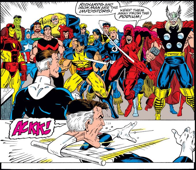 Given that Matt mentioned the podium, we can assume he “saw” the gamma bomb inside it, which the fake Reed activates when he decides the ensuing battle—between those who believe Reed and Tony are imposters and those who don’t—is not going his way.