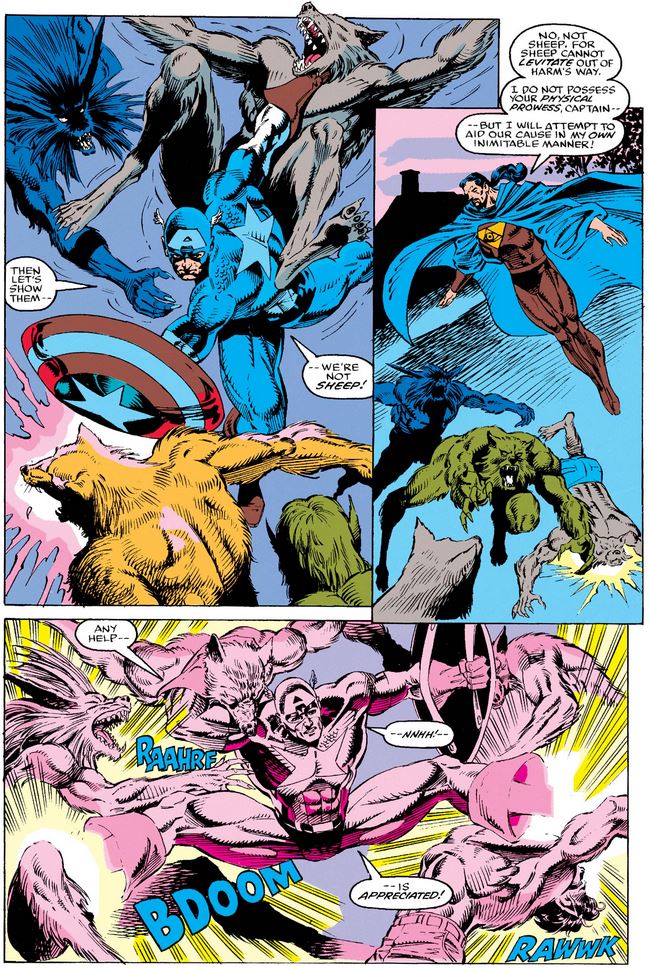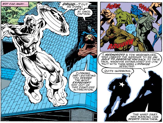Captain America #404 opens where the last issue left off, with Cap and Doctor Druid facing a number of werewolves while investigating violent werewolf activity and searching for the Avengers’ pilot John Jameson (who has spent time as a werewolf himself).