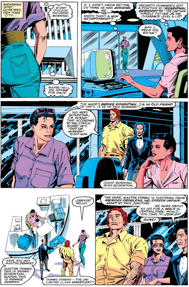 I’ll let that gag marinate while we check in on Bernie, hoping to catch Cap “home” at last. (Who knows how long “Operation: Galactic Storm” actually lasted in-universe?) After meeting the Avengers’ receptionist, Donna Maria Puentes (whom Jack Kirby introduced in issue #206), Bernie—the huge wrestling fan, as you no doubt remember from issue #271—meets Dennis as well.