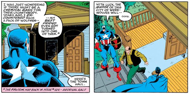 Back in Massachusetts, Cap and Doctor Druid roam the streets of Starkesboro, and after Doc wonders if all the humans on the street transform into werewolves at night, Cap remembers when Sam Wilson was briefly one as well. (Thankfully that never happens again!)