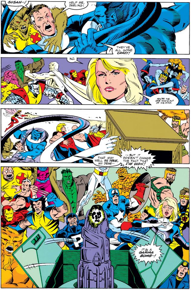 But first, we need to answer a question: What happened after the replacement Reed Richards set off that huge gamma bomb in the last issue? We get our first clue from the final pages of Fantastic Four #367, showing the same scene, but with a focus on Sue, who knows full well this is not her beloved Reed.