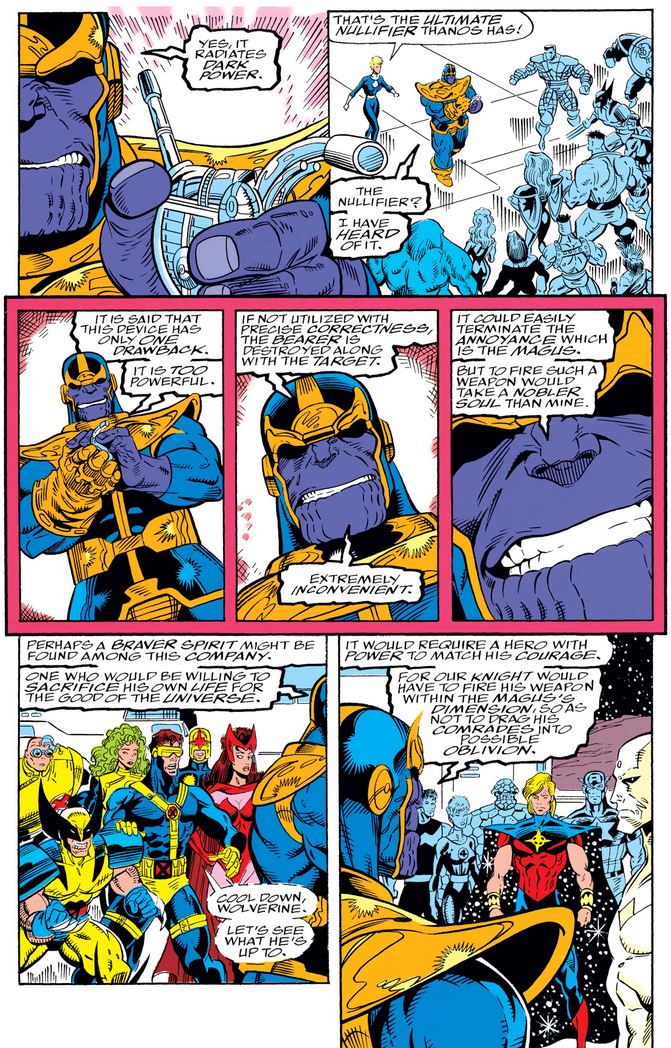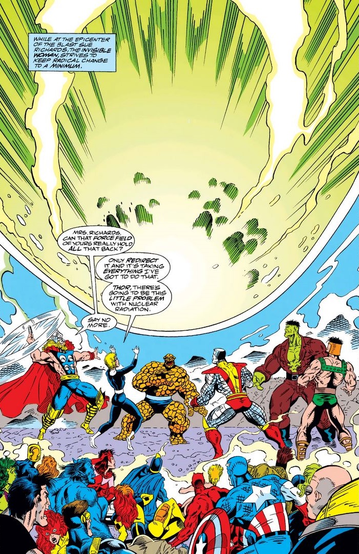After Thor uses his hammer to create a whirlwind to funnel the radiation into space, all attention returns to the replacement Reed and Tony, who escape through a portal generated by Thanos (actually also a replacement) and the Magus (whom the collected heroes reasonably confused for Adam Warlock, of whom the Magus is an evil future alternate-reality version).