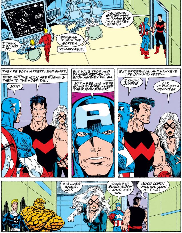 As seen in Fantastic Four #368, Cap takes command, securing a battle headquarters (while sounding just a little condescending to his valued teammates).