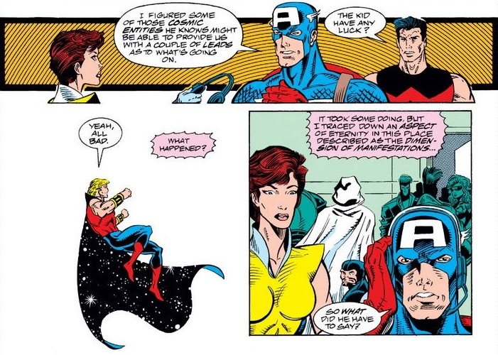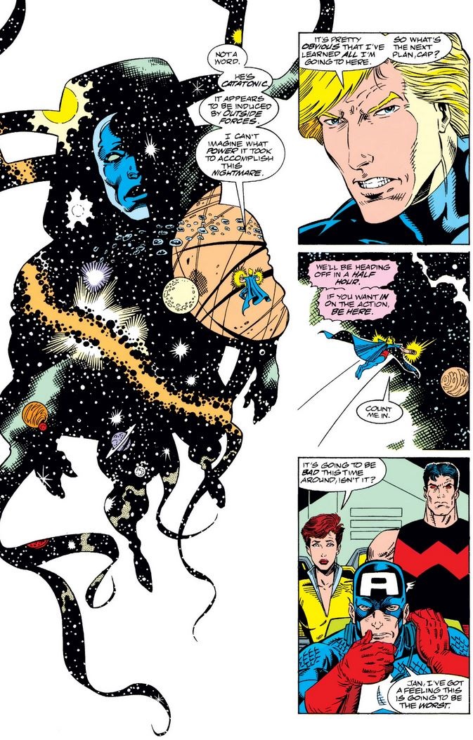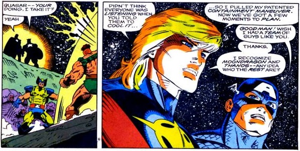 In Quasar #38, we see the title character’s thoughts in the panel above, as he recognizes the stress Cap is under—and thinks what many of us are probably thinking about this event coming so quickly after “Operation: Galactic Storm” (which, in our time, just ended one month before “Infinity War” began).