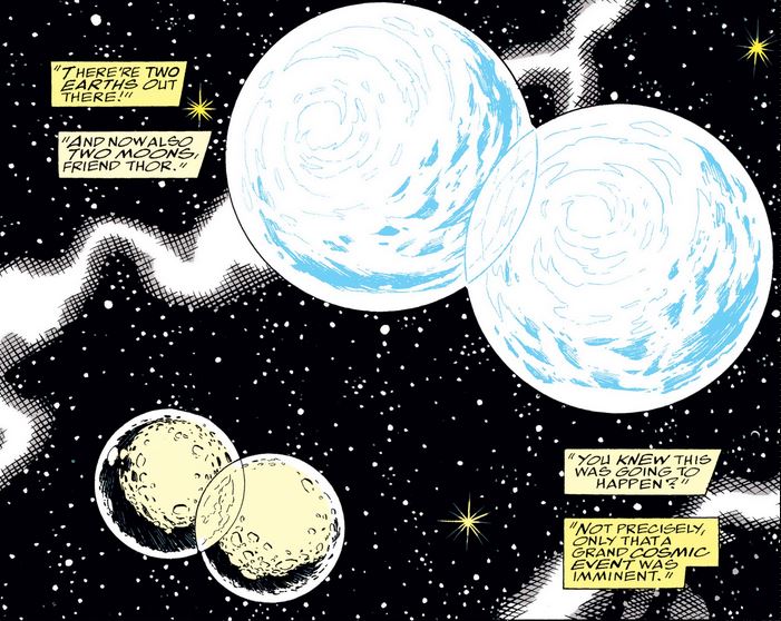 In Infinity War #4, this battle only ends when Doctor Strange’s very kooky quartet show up and Galactus transports them all to his ship, before taking care of the Magus’s doubles on Earth after the Silver Surfer insists on going there to help them, and filling in the rest of the huge cast on the whole story to this point. (I think Cap should have wished he were on the team.) But Galactus isn’t done yet: He also sends Thor back to Earth’s moon to monitor what’s going on, and there, alongside Uatu, he watches something that looks very familiar to this 1980s DC fan.