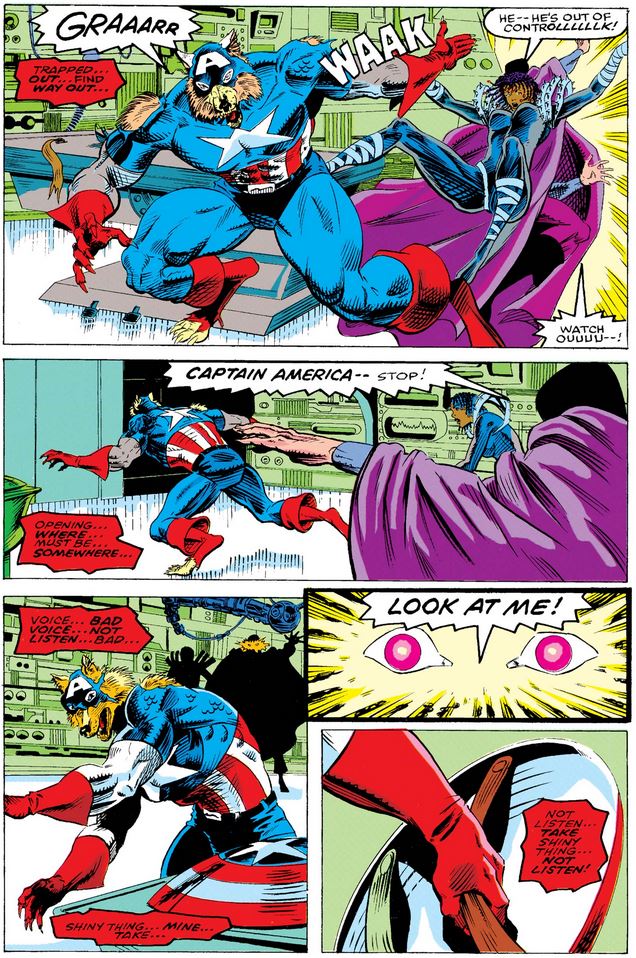 Starwolf wraps Cap and Cable in a carpet—seriously—but after a newly liberated Wolverine frees them, Cap lunges at his true enemy and dislodges the moonstone from his throat, ignoring the tremendous pain caused by holding the mystical gem.