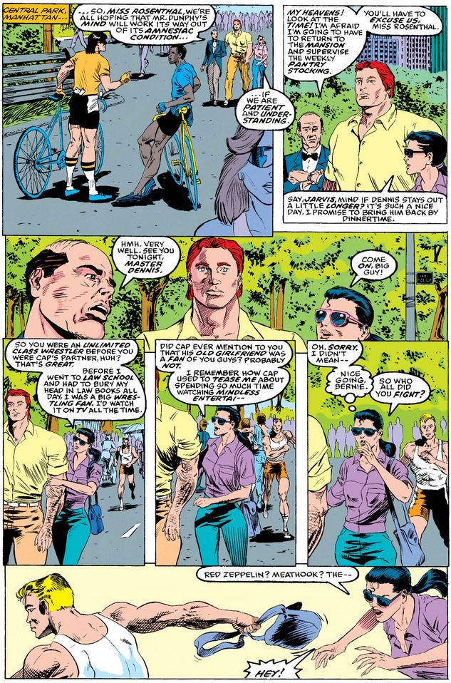 Instead, let’s look in on Bernie Rosenthal, who met the temporarily brain-damaged Dennis Dunphy in the last issue and is now taking a stroll through Central Park with him and Jarvis… until Jarvis gets called away and Bernie lets her inner wrestling fan out.