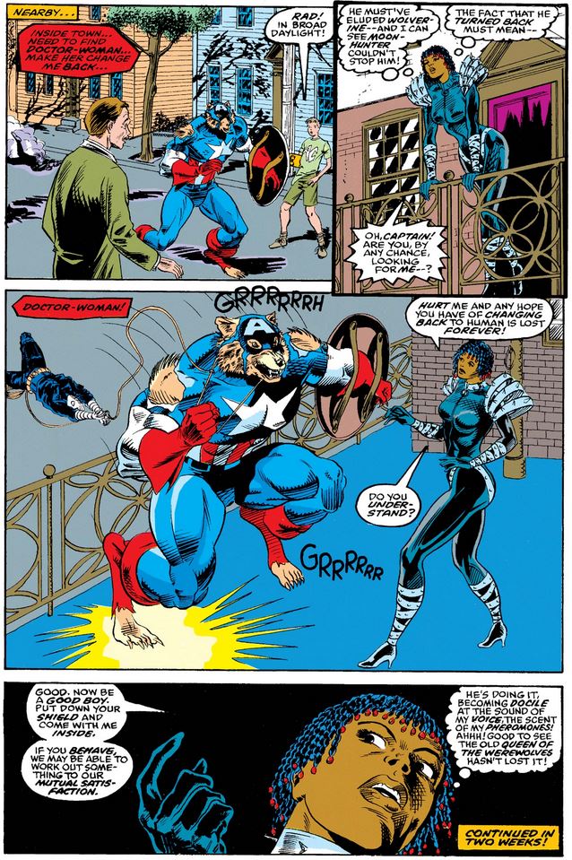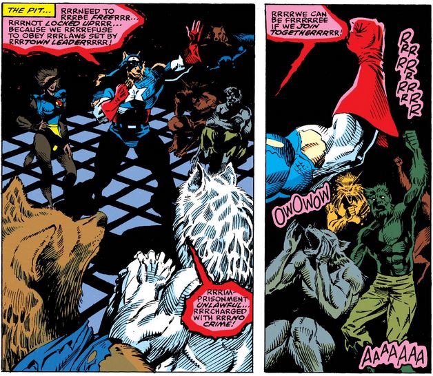 In Captain America #406, Nightshade drops Cap in the “punishment pit,” where he confronts a number of other werewolves…