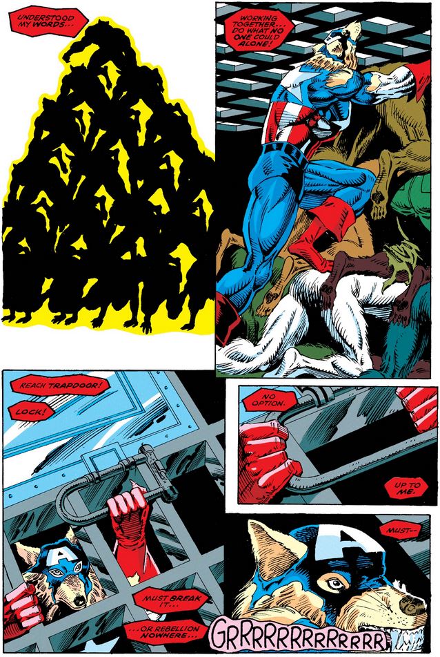 I have to admit, every time I see “THE PIT” I think they’re at a metal concert—maybe they will go to one after they get free, which is Cap’s priority after he takes charge of the werewolf pack and gives a patented Captain America inspirational speech, urging civil disobedience against an unjust authority (rrrrrr).