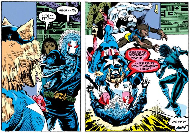 Oh, did I forget to mention Cable showed up, looking for Feral, a wolfish X-Force member who was also drawn to the wolfish vibes of Starkesboro? When he starts shooting, Cap has to fight him to protect the werewolves good and bad.
