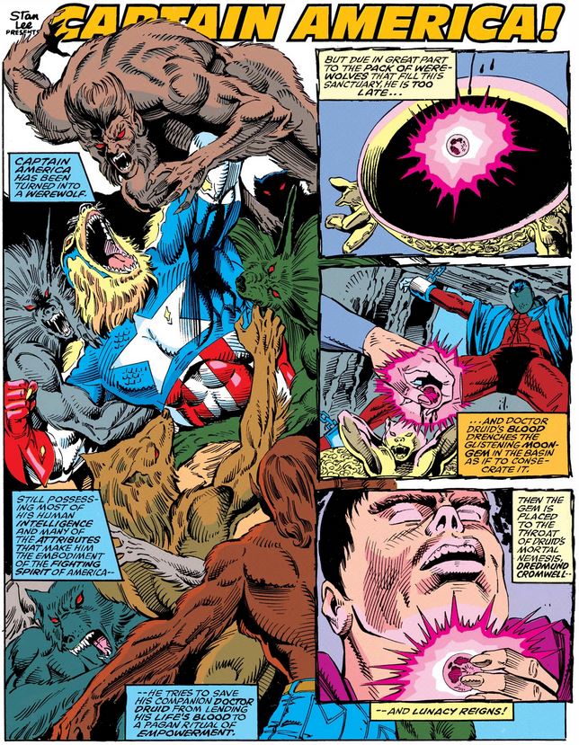 They easily defeat the two humans—and find Jack Russell, the original “Werewolf by Night”—but before they can force Nightshade to change them back, she tells Cap that Doctor Druid is in danger. Cap finds him just in time to see Demon Druid slit his throat and use it along with moonstone to transform himself into a werewolf while retaining his human rationality.