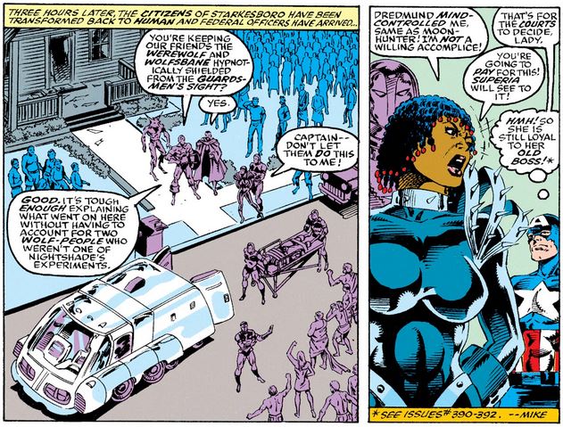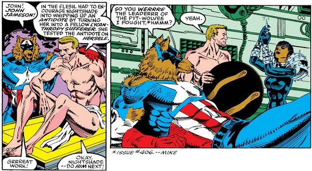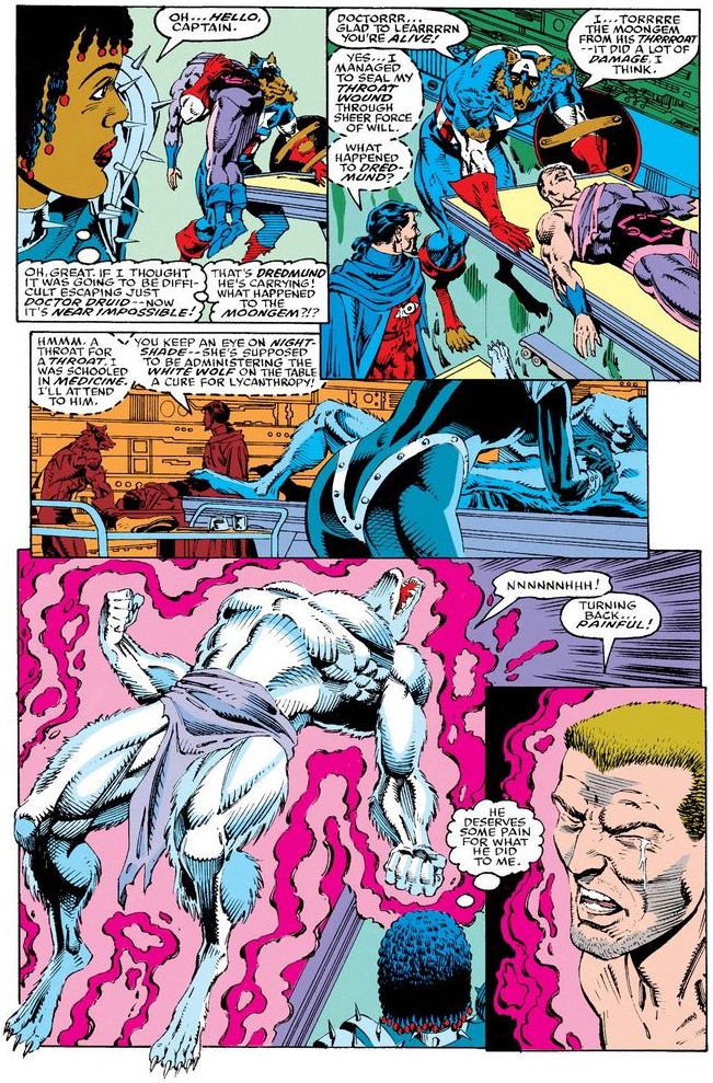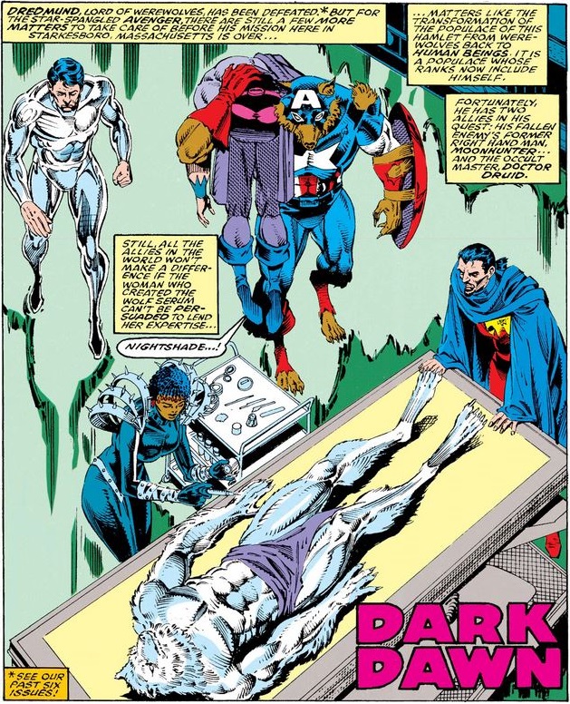 Cap checks with Doctor Druid to make sure that heroes Jack Russell and Wolfsbane—the two werewolves not created by Dredmund—are not taken away for treatment, and then reminds Nightshade of the virtues of the legal system.