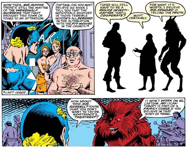 Cap also emphasizes legal procedures when talking to the Naked Mayor about the werewolf murders that first attracted him and Doctor Druid to the town of Starkesboro. Then he checks in with Jack Russell…