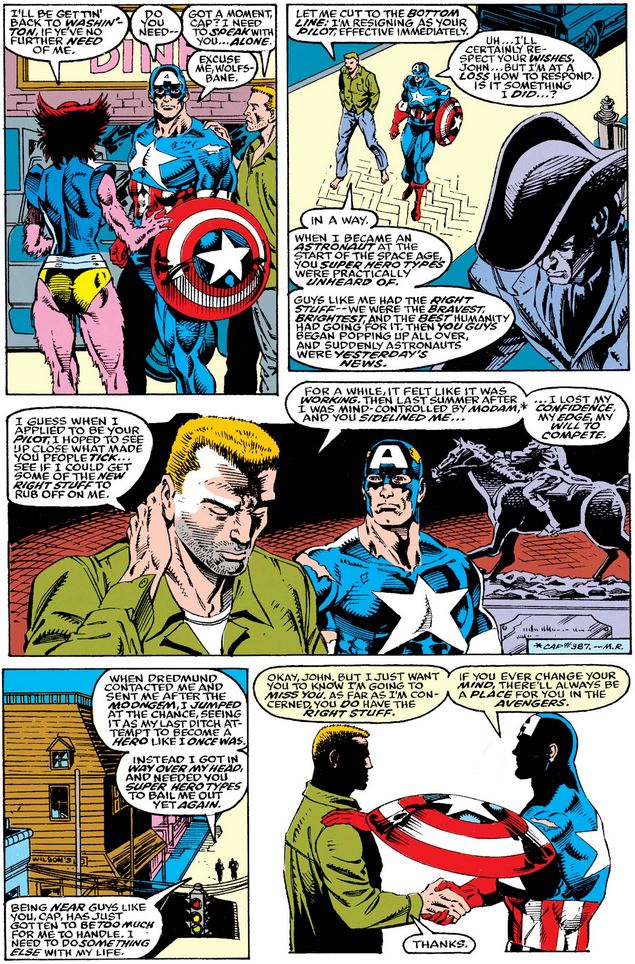 John does most of the talking below, resigning as the Avengers’ pilot before admitting to a severe case if “superhero envy” as a former astronaut now outshined by Avengers left and right, and then explaining how he got mixed up with Dredmund in the first place. Cap listens, and then assures John he’s still a hero who’s always welcome back to the cockpit of the Quinjet.