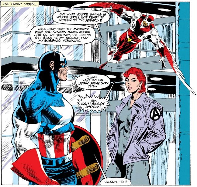 Next, Sam finds Cap and Black Widow catching up on recent events (and Cap’s continued reticence to end his leave of absence from the Avengers). We also learn that some time has passed since Cap returned from Starkesboro, as both the “Infinity War” and “Citizen Kang” storylines took place since then.