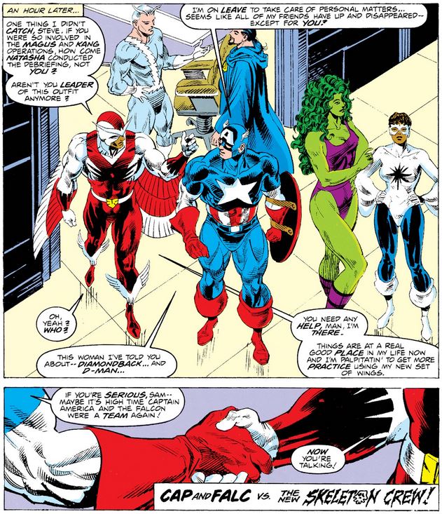 So the team of Captain America and the Falcon is back together and on the search for Rachel (at least) starting in the next issue. (“Friends will be searched for in the order in which they disappeared”… sorry, Dennis, I don’t make the rules.)