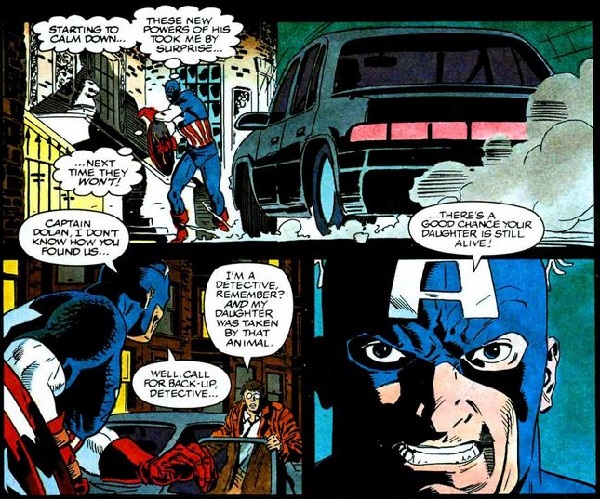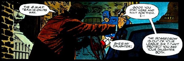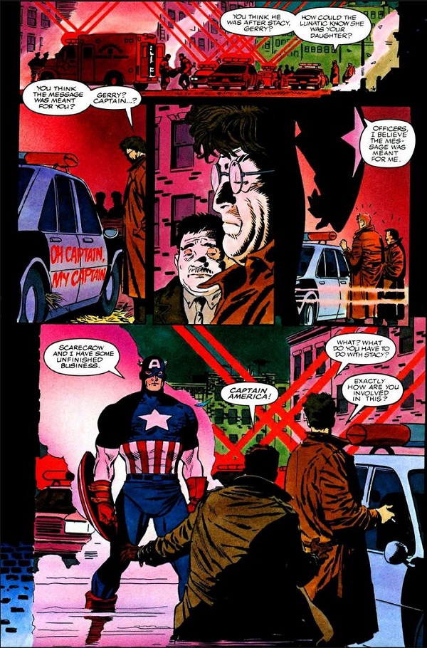 After the Scarecrow murders one police officer and abducts another (Stacy Dolan, daughter of Captain Dolan and girlfriend of Danny Ketch), Cap arrives on the scene and makes it all about him—which, to be fair, the Scarecrow has already confirmed is true.