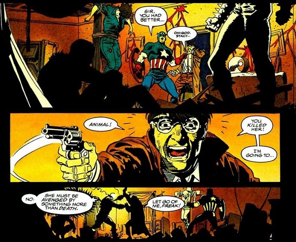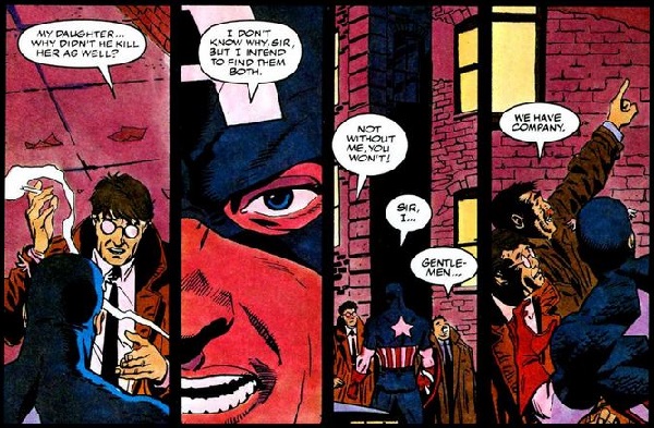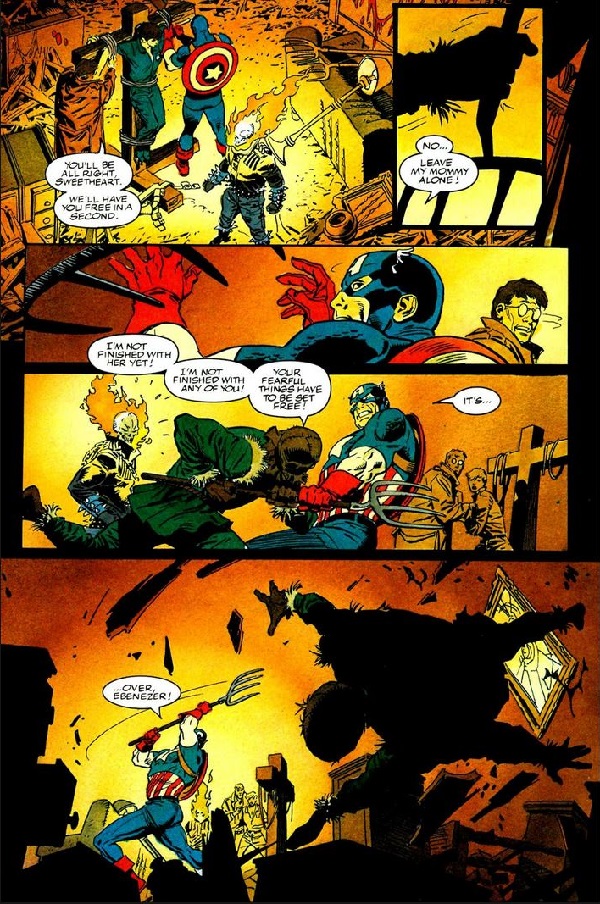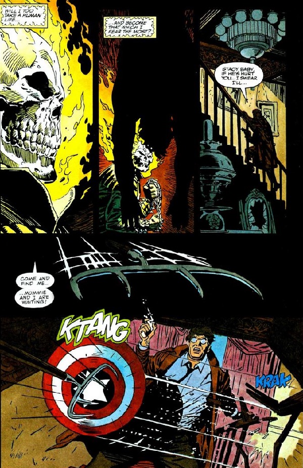 Dolan ignores Cap’s advice, and once inside he sees that the current occupants of the house were viciously slaughtered—which Ghost Rider also sees, and wonders if he will be able to restrain himself from killing Scarecrow in return. As for Dolan, his life is saved only by the last-second appearance of Cap’s shield.