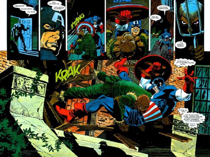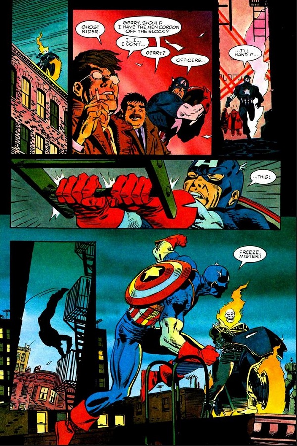 Luckily for him, Ghost Rider uses his chains to pull Scarecrow to the roof, giving Cap a chance to compose himself before Captain Dolan shows up.