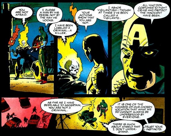 Ghost Rider is impressed that Cap is calm and reasonable to him, giving the new hero the benefit of the doubt in contrast to his media coverage. Cap also makes a more general statement about superheroes and the way they are perceived by authorities, foreshadowing some arguments he will make during the Civil War, which are all the more powerful coming from someone who is presumably the most well-liked and regarded of the world’s superheroes.