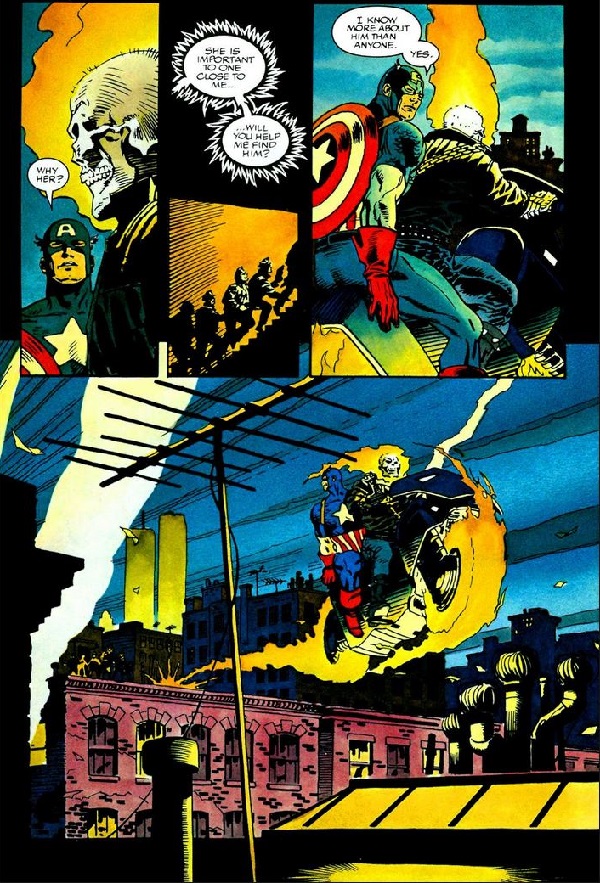 This one-shot brings Captain America together with the latest Ghost Rider (Danny Ketch) for the first time (Cap having faced the O.G.R., Johnny Blaze, in Avengers #214). Although this story focuses more on the newer hero, it does provide some insights into Cap’s feelings on a number of issues (as well as some incredible pencil-work from Lee Weeks).