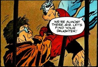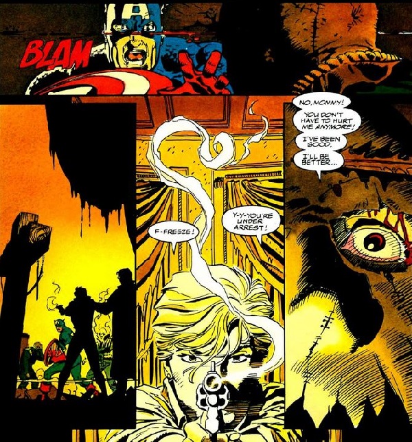 What a face! I assume Cap is still fighting the last vestiges of Scarecrow’s influence while dealing with the angry father—which he continues to do below as he urges Dolan to stay outside.