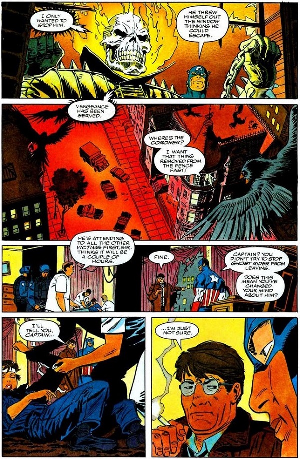 When Ghost Rider tries to snag Scarecrow in his chains again, the villain jumps out a window and impales himself on a fencepost. Cap declines to opine on Ghost Rider’s comment about vengeance, and instead asks Dolan if he feels better about his local “vigilante” now.