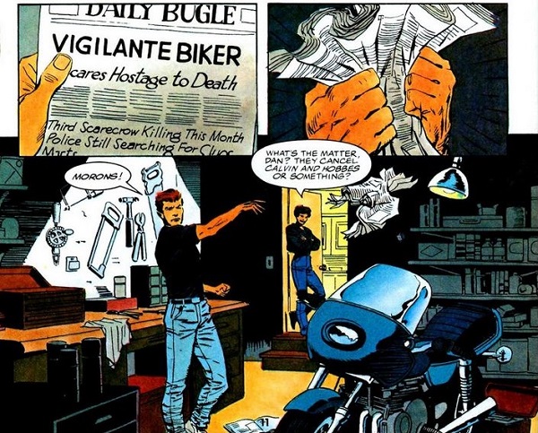 …before a bullet grazes Scarecrow’s forehead—a bullet fired by Stacy, whom the deluded Scarecrow thinks is his mother.