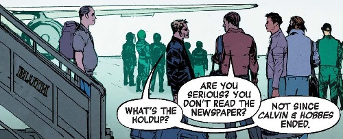 Calvin and Hobbes would not end until December 31, 1995—which had a definite effect on another superhero, Clint Barton, as we see in Tales of Suspense #100 (February 2018), by Matthew Rosenberg, Travel Foreman, and Rachelle Rosenberg: