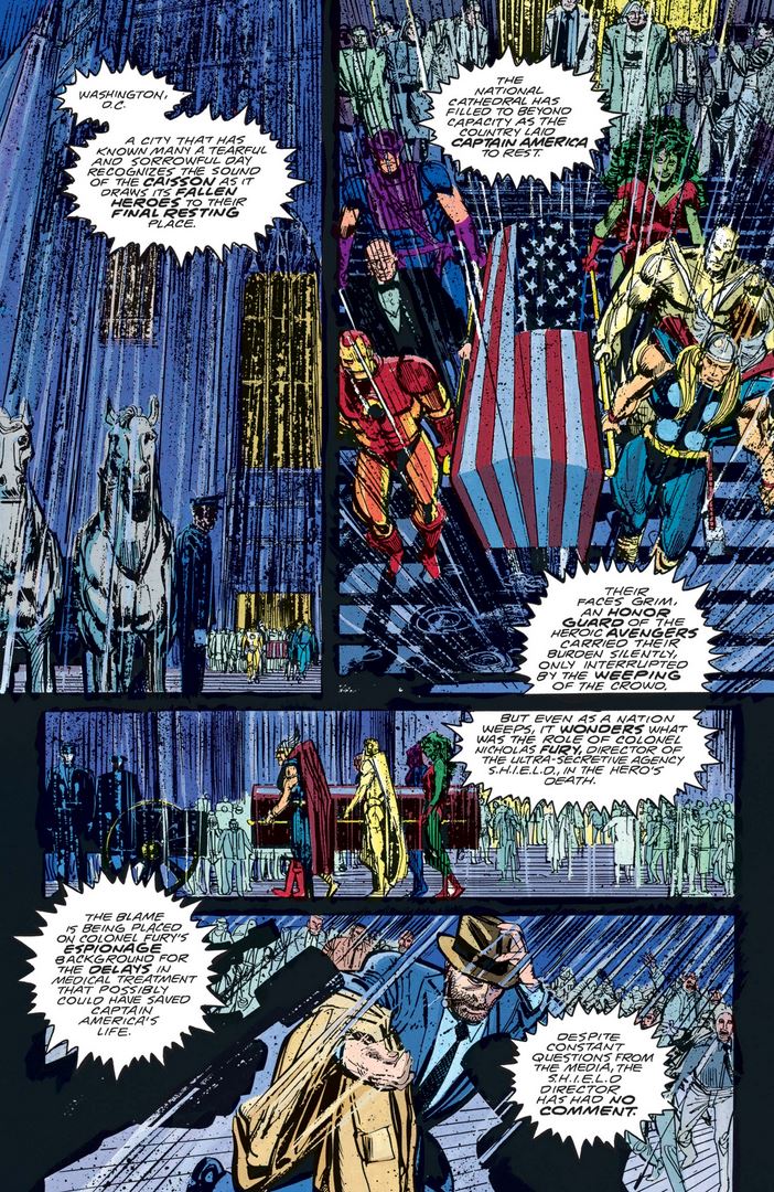 Below we see the grisly aftermath of Frank’s actions as Cap is wheeled into Walter Reed National Military Medical Center, accompanied by Nick Fury…