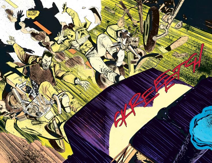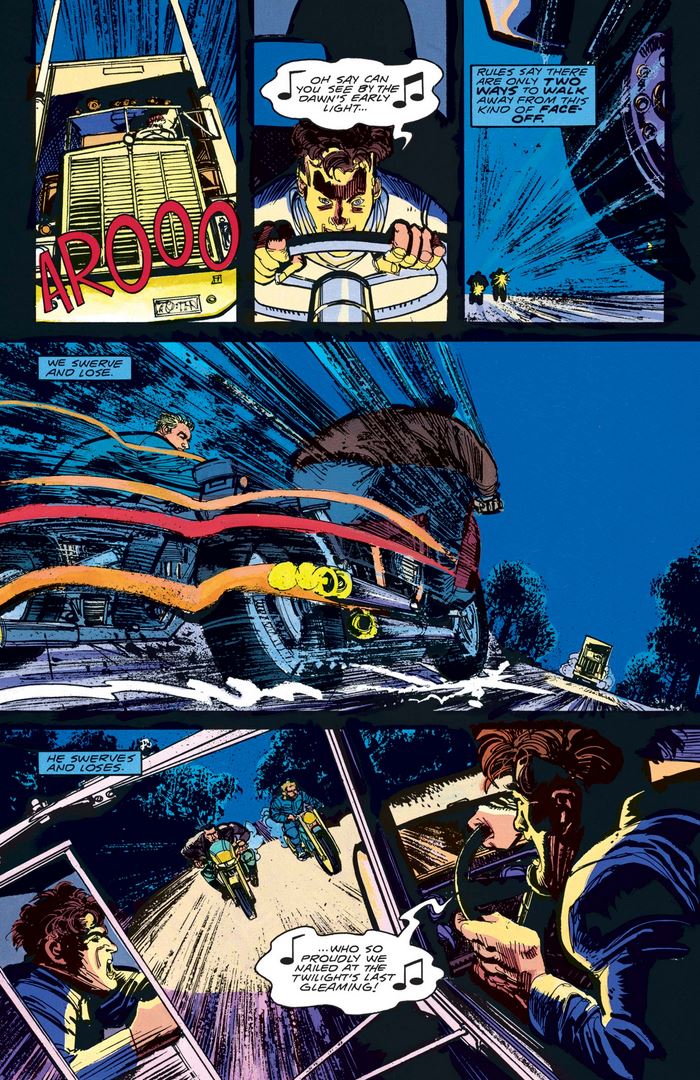 As Cap and Frank face off against the truck—the driver of which, Theopolus, would seem to know who Cap is as well, judging from his tune of choice—our hero reviews the rules of “Chicken.”