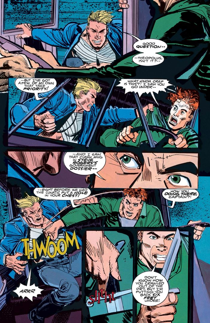 Cap and Frank hold on to the chassis of the truck until Cap can climb into the cab to surprise Theopolus, who recovers quickly enough from his shock to take advantage of Cap’s injuries.