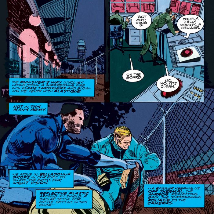 Once back in action, Cap finds himself countering Frank’s more assertive approach with stealth (although I don’t see how reflective material helps one hide in the dark).