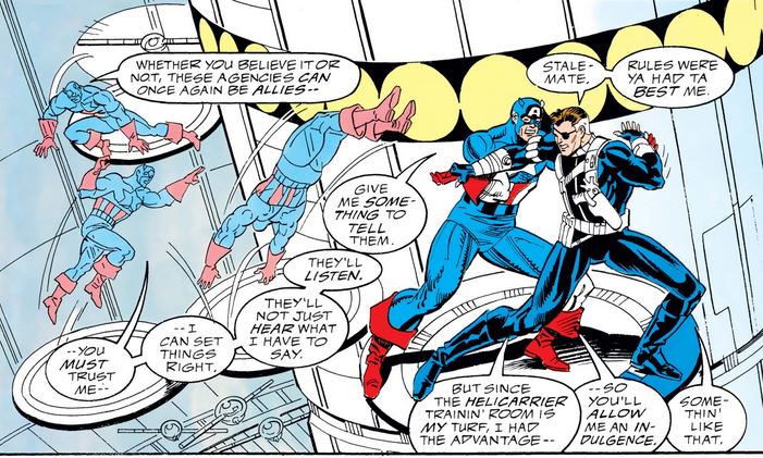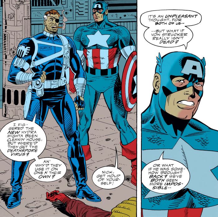 Nick seems to be testing Cap, although I suspect he’s just teasing, making his old pal work for his secrets (while Baron von Strucker, presumed dead, enjoys his own sparring session below).