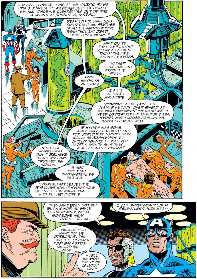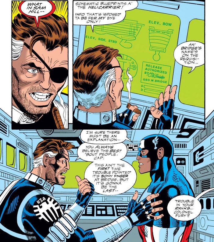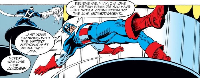 I imagine Cap would have more trust in Fury than Gyrich, given his tense interactions with the latter regarding Avengers business as well as Gyrich’s activities on the Commission on Superhuman Activity, the same body that led him to Cap’s retirement Captain America #332.