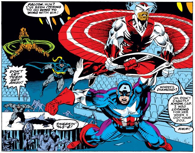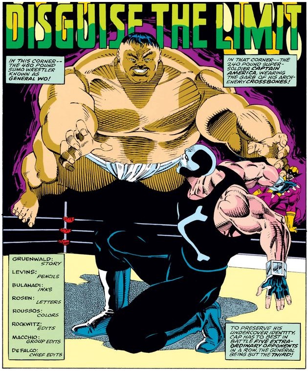 Captain America #412 opens with General Wo, the sumo wrestler Cap faced back in Tales of Suspense #61, facing Cap, whom Sersi transformed into Crossbones in the last issue so he, Falcon, and Diamondback could infiltrate an underground weapons expo. (“Kids get in free after 3pm!”)