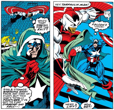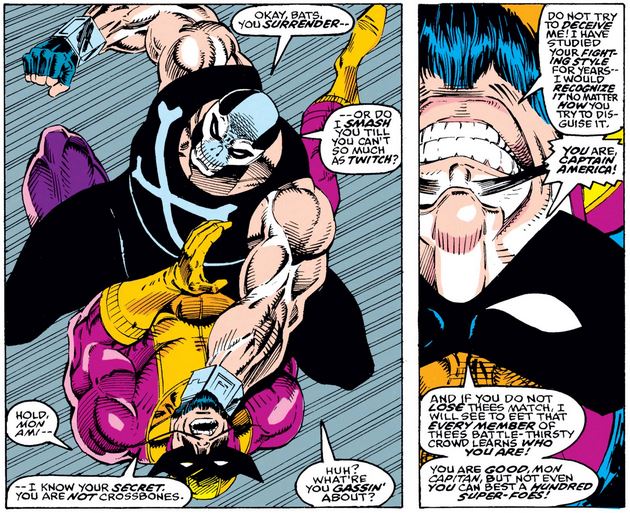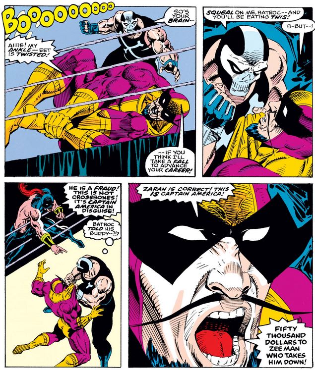Of course, Cap doesn’t fall for it, putting on his best Crossbones to threaten Batroc into le silence… but it is all for naught as Zaran blows his secret anyway.