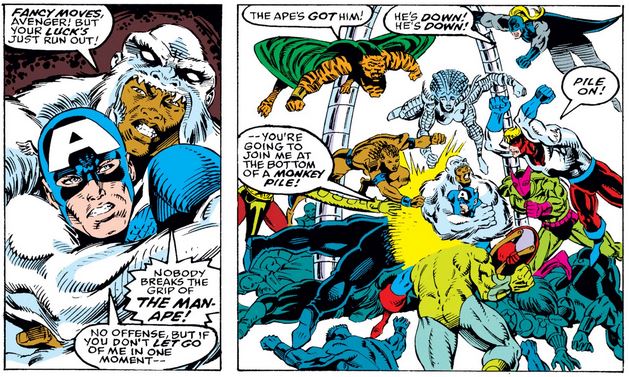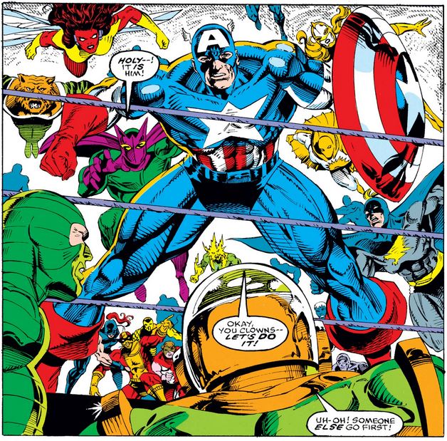 Even though Cap loves a good workout, his concern for his friends takes priority, so he goads the villains into piling on to him…