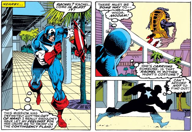 Cap curses his insufficiently thorough preparation because he was “obsessed” with Rachel, but then thinks he sees her being carried by MODAM (the version of MODOK introduced in issue #387), and chases after them.