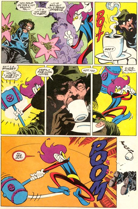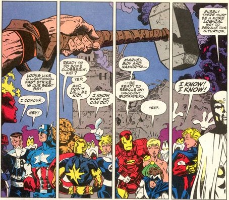 And switching abruptly from the deadly to the deadly-funny: In the final issue of the miniseries Slapstick, the title character is trying to convince the heavy hitters that he knows the best way to deal with the Major Threat of the Day…