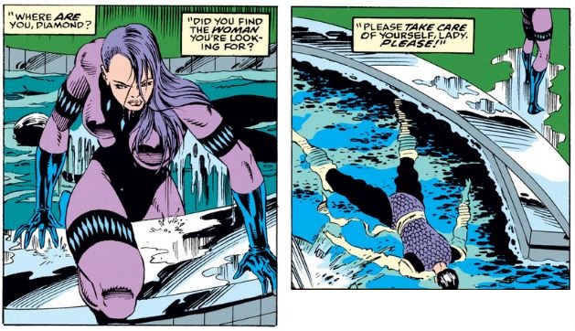 …seemingly forgetting he’s not disguised as Crossbones anymore, judging from the feet he delivers to MODAM’s eyes below. But in the end, it wasn’t Rachel he saw, but Superia, whom he still tries to save (even though he wouldn’t have pursued her in the first place if he knew who she really was).