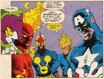 …and sneaks out the bottom. Of course, skulking away offends Cap’s sense of honor, which unlike Batroc’s is still intact. (Speaking of Looney Tunes: This always reminds me of the cartoons in which a bunch of thugs jump on one character, brawling in a huge cloud of dust with fists and feet poking out, and the main character slips out of the cloud while the rest continue fighting each other.)