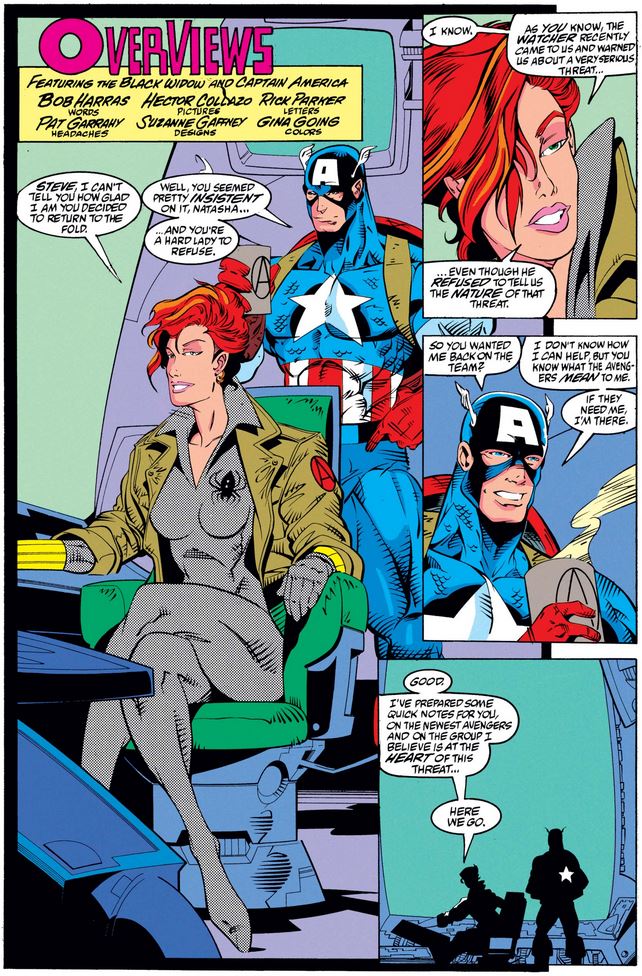 “Overviews”: Bob Harras (writer), Hector Collazo (pencils), Pat Garrahy, Suzanne Gaffney, and Gina Going (colors), Rick Parker (letters).