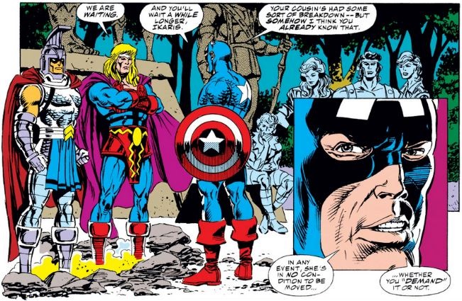 Immediately after requesting Sersi to be brought to them, Ikaris stresses his lack of patience, which Cap dismisses out of hand, standing by his fellow Avenger (whether Eternal or not).